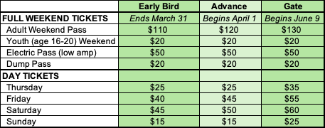 Weekend tickets include unreserved camping (camping is limited and first-come first-served)